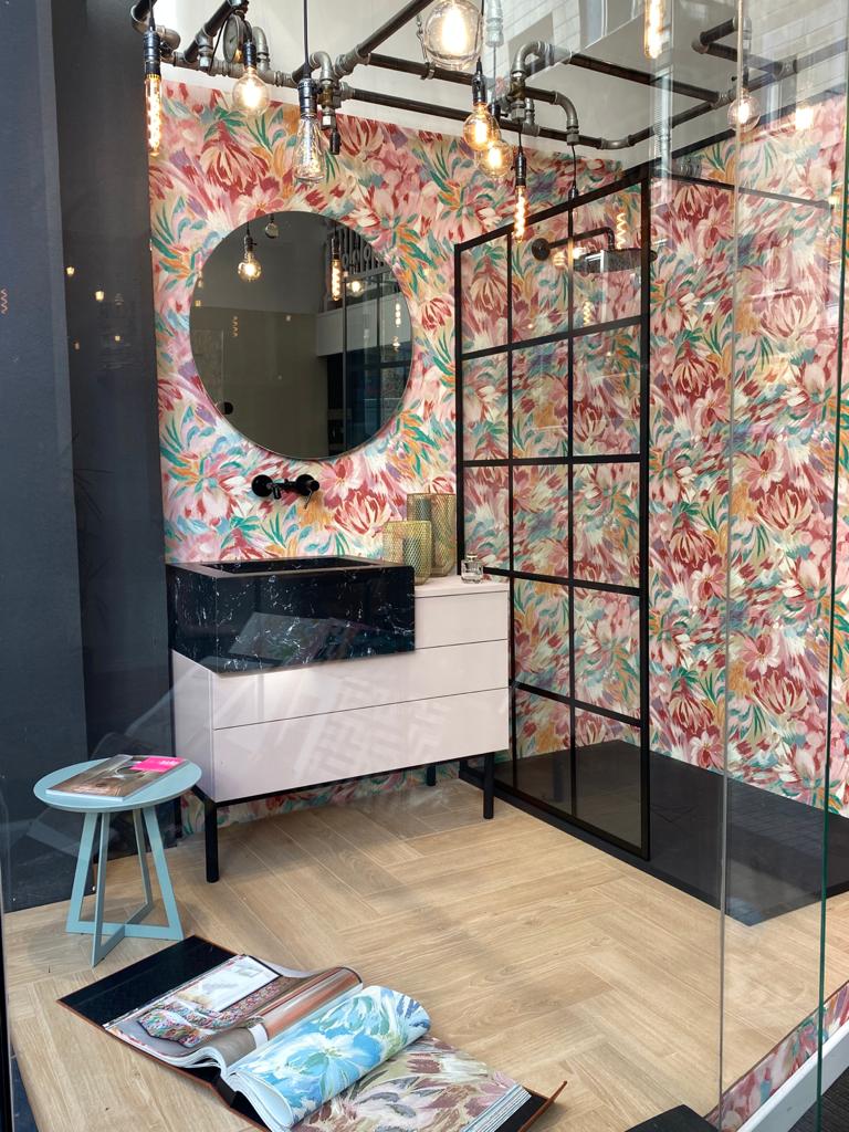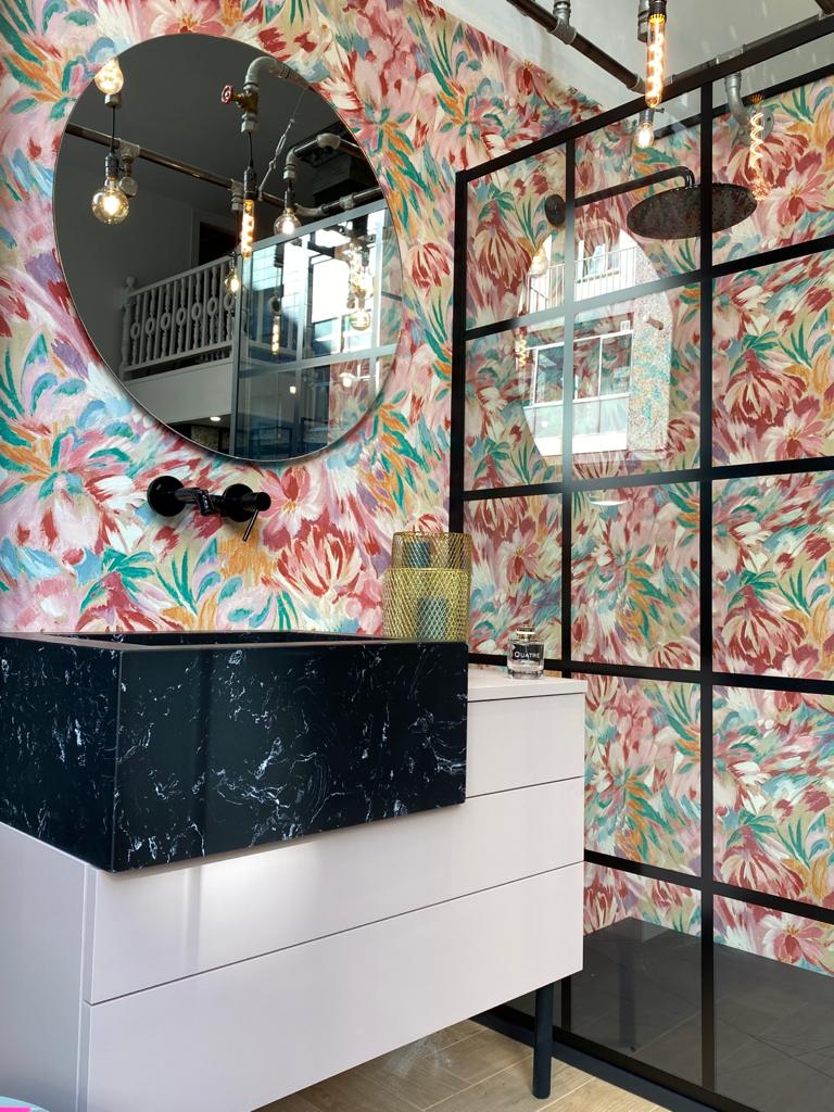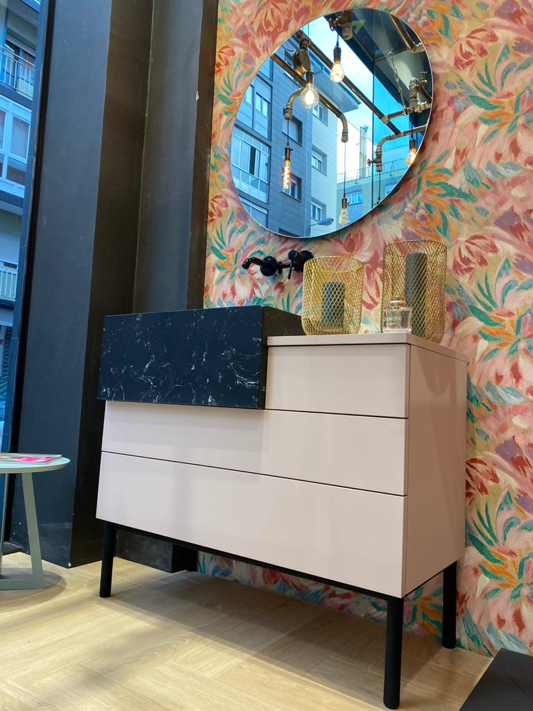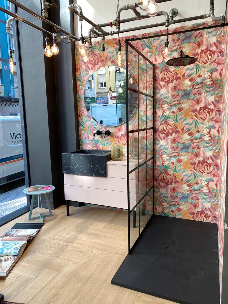 Con un toque romántico, nos hemos decidido por exponer un fabuloso mueble de la prestigiosa marca Sanchis, fabricante nacional con gran trayectoria en el sector, en un tono rosa empolvado pero con un magnifico lavabo de piedra natural con formas rectas. Hacemos el contraste gracias al papel de Missoni, el cual parece un tejido natural en una gama cromática vistosa y muy armónica. No podemos olvidarnos del plato de ducha, nuevo diseño de Aquabella, en el que las texturas y las geometrías cobran protagonismo para alejarnos de las pizarras convencionales. Como broche final nos decantamos por una grifería empotrada negra en brillo de formas redondas al igual que el espejo.