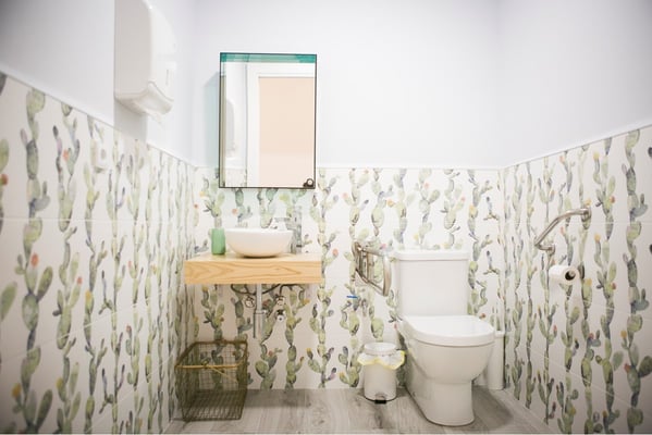 El aseo esta alicatado hasta media altura con azulejo estilo cactus que le otorga una frescura acorde con el resto del local.