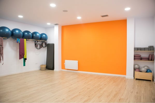 Pavimento laminado imitación madera, de tabla ancha y continuo en todo el local. Pintura blanca en la mayoría de las estancias, con ligeras variaciones como en la zona privada que se pinto en un verde mas subido. En el gimnasio se opto por un naranja fuerte para dar energía a la habitación.