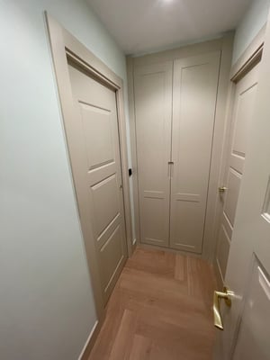 Destacar también el suelo en espiga , las puertas y armarios en color arena y el mueble recibidor diseñado y fabricado por nosotros en un color nude super elegante, que destaca sobre el papel